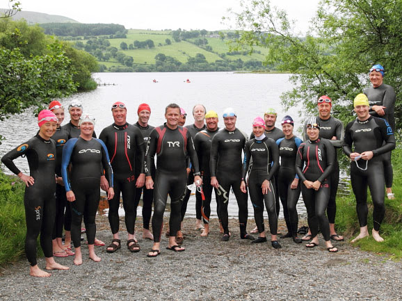 Saturday morning – 9am, Lakeside at Bala, MVH flags in place, 22 of MVH listened intently to the coaches instructions. “Ok – as the water may be a bit cool – we will practice fast starts to warm up and then swim in fast, medium and ‘hurry up’ packs of swimmers to the buoy – oh the buoy – you will see it just around the corner…”